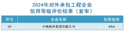 根據(jù)《中國(guó)對(duì)外承包工程商會(huì)企業(yè)信用等級(jí)評(píng)價(jià)管理辦法》,經(jīng)過(guò)專(zhuān)業(yè)機(jī)構(gòu)評(píng)價(jià)、評(píng)審委員會(huì)審議、網(wǎng)上公示等程序,中地海外公司獲評(píng)“2024年度對(duì)外承包工程信用等級(jí)AAA級(jí)企業(yè)”(最高級(jí))。這是公司連續(xù)第17年獲此殊榮,是對(duì)公司誠(chéng)信經(jīng)營(yíng)和海外業(yè)務(wù)綜合能力的充分肯定,也是公司履約能力、投標(biāo)信譽(yù)、綜合實(shí)力的重要體現(xiàn),為進(jìn)一步做好市場(chǎng)開(kāi)拓、項(xiàng)目執(zhí)行和質(zhì)量效益雙提升起到積極的作用。